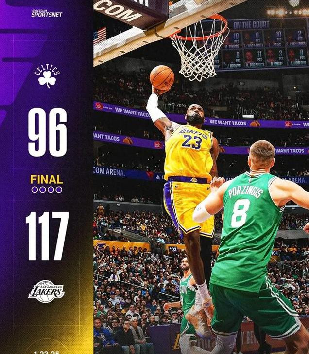 北京时间1月24日,NBA常规赛继续进行,湖人主场迎战凯尔特人。首节比赛,湖人率先进入状态,多点开花的湖人连中三分建立领先优势,浓眉连续内线造杀伤,绿军进攻效率不高,末段湖人连得7分,首节结束,湖人34-23领先绿军。次节较量,绿军连得5分,里弗斯和詹姆斯里突外投连得5分,湖人外线连续开火,半场战罢,湖人67-48领先绿军。易边再战,绿军开始反扑送出一波14-7的攻势蚕食比分,但随后绿军进攻端突然哑火,海斯接连在内线得手帮助湖人稳住局面,三节结束,湖人83-68领先。末节比赛,湖人越战越勇,詹姆斯率队打出9-0的攻势将分差扩大至20分以上,绿军追分不及,比赛很快失去悬念,最终湖人117-96大胜凯尔特人。